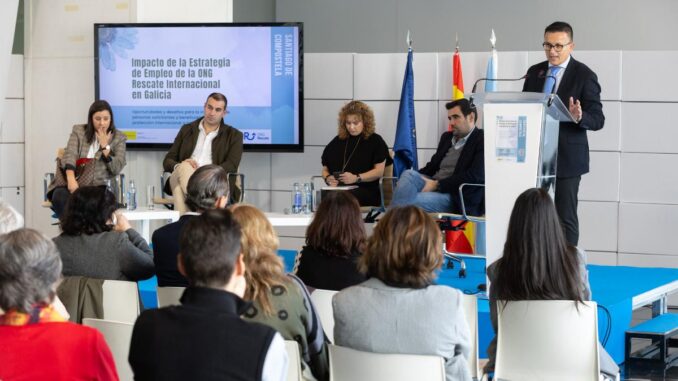 El conselleiro de Emprego, Comercio e Emigración, José González, acompañado por la directora xeral de Formación e Cualificación para o Emprego, Zeltia Lado, y por el director xeral de Inclusión Social, Arturo Parrado, clausuró hoy la jornada Oportunidades e desafíos para a integración de persoas solicitantes e beneficiarias de protección internacional a través do emprego organizada por la ONG Rescate Internacional, donde puso de relieve la colaboración con esta entidad en el marco del pionero programa de arraigo para la formación dirigido a migrantes en situación irregular que, sumando los resultados de las dos ediciones, habrá logrado al final del año la regularización de unas 280 personas a través de la capacitación para un empleo de calidad, al tiempo que se cubrieron vacantes laborales en el tejido productivo gallego. Así lo dijo el conselleiro en una intervención en la que aprovechó para trasladar al Gobierno central demandas como que rectifique y atienda a las microcredenciales como una herramienta clave para la inserción sociolaboral de las personas migrantes.